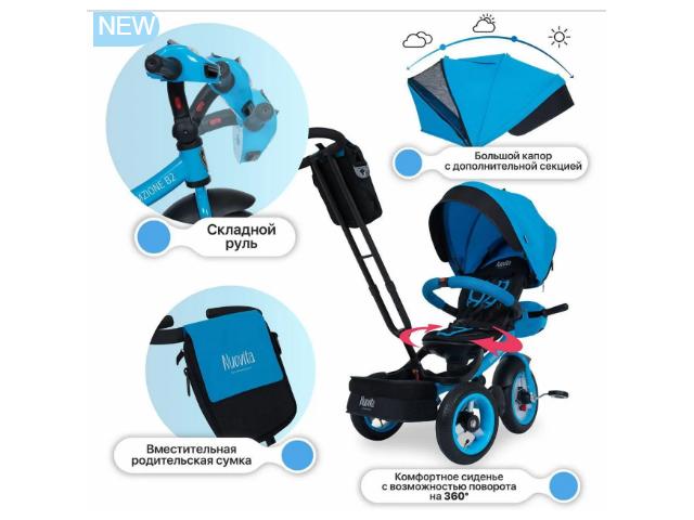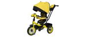 - 3. Трехколесный велосипед для начинающих со складной подножкой. Благодаря функции свободного хода колеса малыш может крутить педали, имитируя самостоятельную езду. Он получает новый опыт и учится кататься, движение велосипеда в это время контролирует взрослый. Капор и бампер можно снять. Подойдет малышам от 2-х лет.