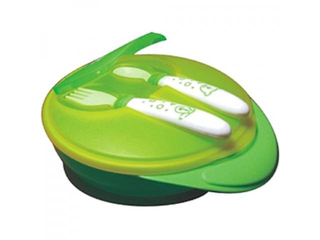 Тарелочка нескользящая МИР ДЕТСТВА с крышкой, вилкой и ложкой, три секции, от 4 месяцев