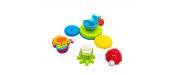 - набор представляет собой модуль с фонтанчиком, в комплект к которому идут 2 пластмассовые игрушки в виде черепашки и китенка, игрушка-осьминог с вертушкой, которая приходит в движение от направленного на нее потока воды, и 4 горшочка в виде рыбок, из которых можно составлять пирамидки