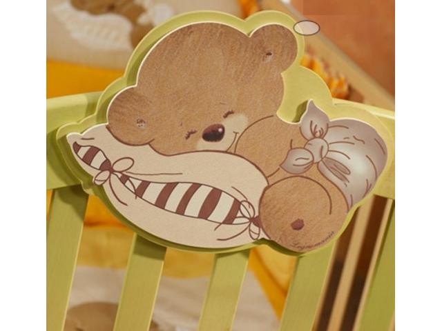 Кроватка отличается от других своим большим мишкой на подушке, который сладко спит.
