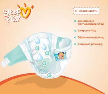 Для того чтобы малыш гармонично развивался и всегда радовал родителей своим отличным настроением, очень важно обеспечить ему комфортные условия для спокойного сна и активных игр. Подгузники Sleep&Play содержат уникальный впитывающий слой и экстракт ромашки, обладающий смягчающими и антисептическими свойствами. Подгузники Sleep&Play не только отлично впитывают влагу и удерживают ее внутри, обеспечивая малышу до 9 часов безмятежного сна, но и эффективно ухаживают за нежной детской кожей - и все это по доступной цене!